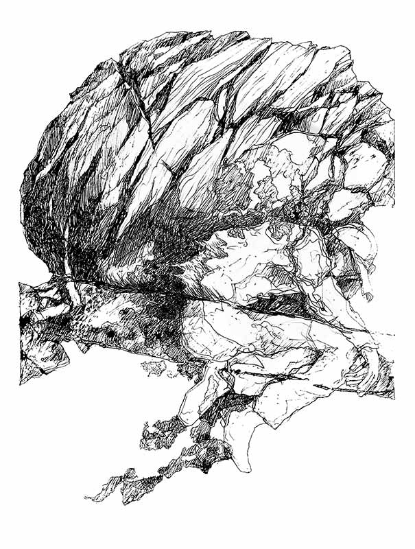 Quant aux dessins à l’encre de Chine, autre partie des pièces exposées, ils jouent un rôle plus mystérieux dans l’élaboration de mes photos. Je les appelle "mes exercices de contemplation". Ils procèdent plus de la compréhension de la roche que de son observation, et ce sont parfois de pures inventions. Mais pendant le temps de leur réalisation qui est très lent, le regard s’affine pour pouvoir enfin choisir dans les séries de photographies celles qui vont constituer l’œuvre finale. Il y a donc une mise à l’épreuve nécessaire des possibilités du regard par celles de la main au cours de ces allers-retours. Et certaines figures pour trouver leur support minéral au bon moment en ont connu plusieurs !