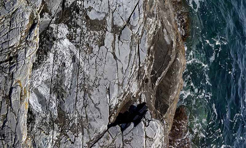 D’un geste de la main une silhouette humaine est apposée à la craie sur la roche. Elle s’élance, vole, chute, dans un état incertain où les lois de l’apesanteur semblent lui jouer des tours. Elle s’inscrit dans un paysage naturel plus vaste, de côtes déchiquetées, de falaises stratifiées, comme abandonnée à l’usure de l’écume et du sel de la mer Egée.