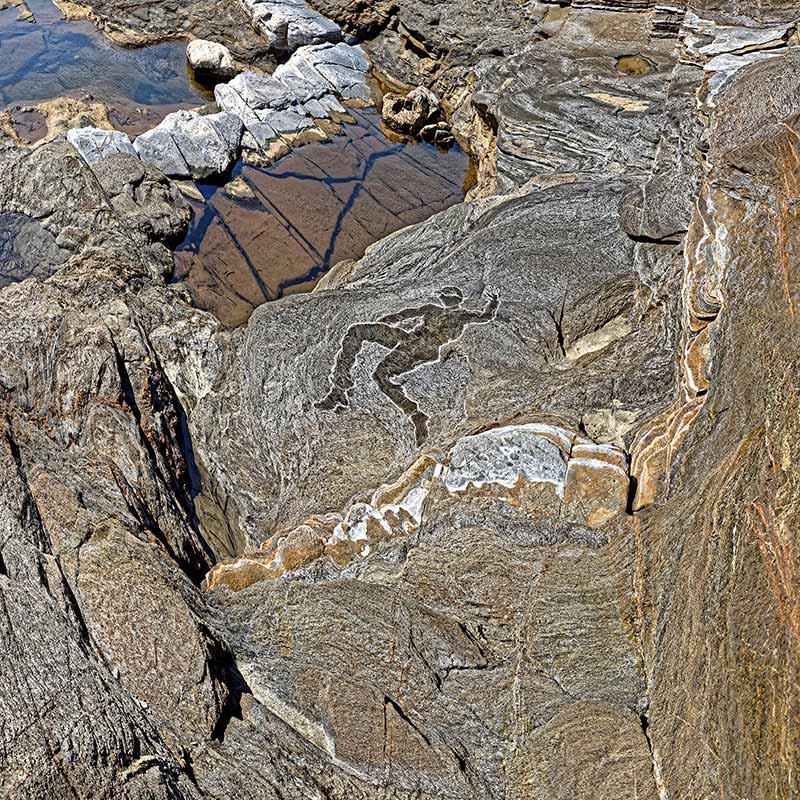 But what happens? How far is the photographer from his subject? Is he on the same level as the image captured, or below or above? Is this human silhouette gigantic or Lilliputian? Is it defined solely by chalk or is it guided by the mineral strata, the folds of the rock that stretch or sever the figure?