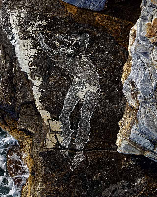But what happens? How far is the photographer from his subject? Is he on the same level as the image captured, or below or above? Is this human silhouette gigantic or Lilliputian? Is it defined solely by chalk or is it guided by the mineral strata, the folds of the rock that stretch or sever the figure?