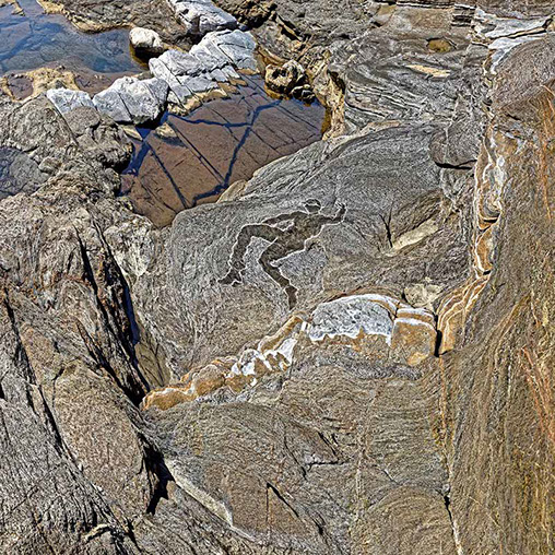 Quant aux dessins à l’encre de Chine, autre partie des pièces exposées, ils jouent un rôle plus mystérieux dans l’élaboration de mes photos. Je les appelle "mes exercices de contemplation". Ils procèdent plus de la compréhension de la roche que de son observation, et ce sont parfois de pures inventions. Mais pendant le temps de leur réalisation qui est très lent, le regard s’affine pour pouvoir enfin choisir dans les séries de photographies celles qui vont constituer l’œuvre finale. Il y a donc une mise à l’épreuve nécessaire des possibilités du regard par celles de la main au cours de ces allers-retours. Et certaines figures pour trouver leur support minéral au bon moment en ont connu plusieurs !