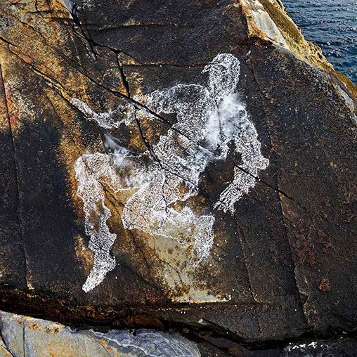Με μια χειρονομία προστίθεται με κιμωλία μια ανθρώπινη σιλουέτα πάνω στο βράχο. Ορμάει, πετάει, πέφτει, σε μια αβέβαιη κατάσταση όπου οι νόμοι της έλλειψης βαρύτητας φαίνεται να της παίζουν παιχνίδια. Εγγράφεται σ’ ένα ευρύτερο φυσικό τοπίο, ακανόνιστα δαντελωτές ακτές, στρωματοποιημένα βράχια, σαν να τα έξυσαν το αλάτι και ο αφρός του Αιγαίου.