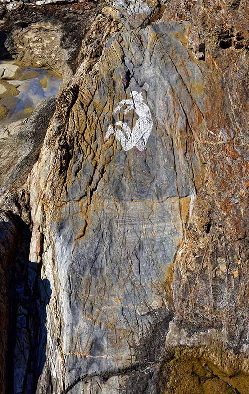 Mais qu’en est-il ? A quelle distance se situe le photographe de son sujet ? Est-il sur le même plan, en aplomb ou en surplomb de l’image saisie ? Cette silhouette humaine est-elle géante ou lilliputienne ? Son tracé est-il défini uniquement par la craie, et n’est-il pas guidé par les strates minérales, les plis de la roche qui prolongent la figure ou la sectionne ?