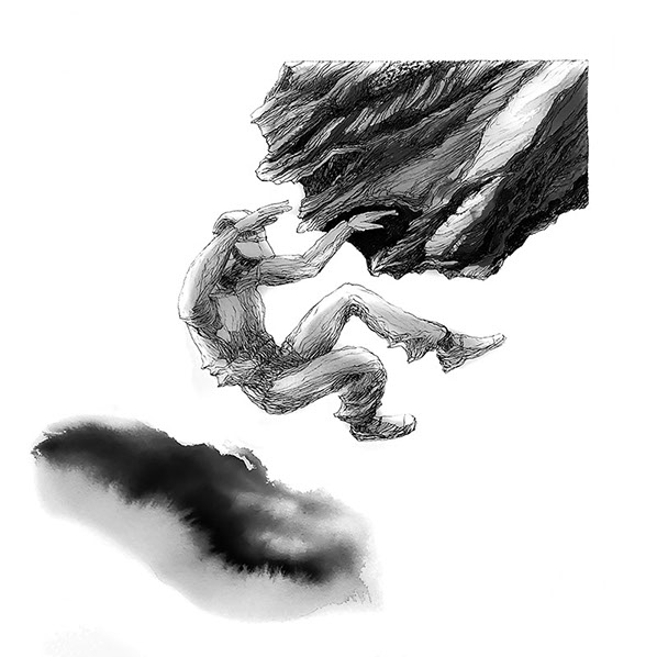 D’un geste de la main une silhouette humaine est apposée à la craie sur la roche. Elle s’élance, vole, chute, dans un état incertain où les lois de l’apesanteur semblent lui jouer des tours. Elle s’inscrit dans un paysage naturel plus vaste, de côtes déchiquetées, de falaises stratifiées, comme abandonnée à l’usure de l’écume et du sel de la mer Egée.