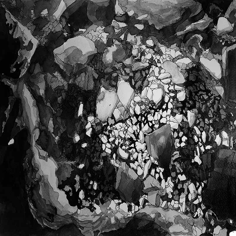 Quant aux dessins à l’encre de Chine, autre partie des pièces exposées, ils jouent un rôle plus mystérieux dans l’élaboration de mes photos. Je les appelle "mes exercices de contemplation". Ils procèdent plus de la compréhension de la roche que de son observation, et ce sont parfois de pures inventions. Mais pendant le temps de leur réalisation qui est très lent, le regard s’affine pour pouvoir enfin choisir dans les séries de photographies celles qui vont constituer l’œuvre finale. Il y a donc une mise à l’épreuve nécessaire des possibilités du regard par celles de la main au cours de ces allers-retours. Et certaines figures pour trouver leur support minéral au bon moment en ont connu plusieurs !