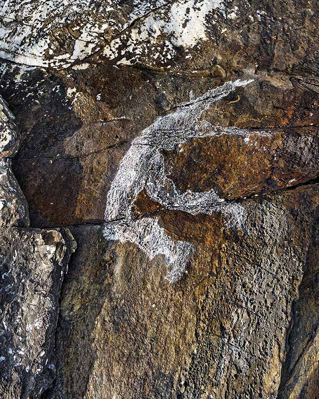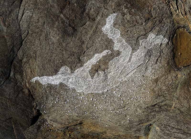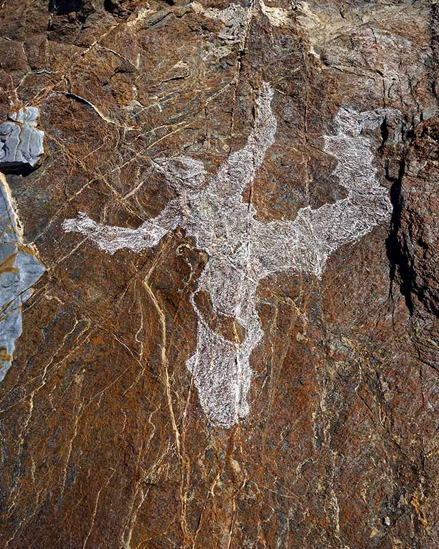 But what happens? How far is the photographer from his subject? Is he on the same level as the image captured, or below or above? Is this human silhouette gigantic or Lilliputian? Is it defined solely by chalk or is it guided by the mineral strata, the folds of the rock that stretch or sever the figure?